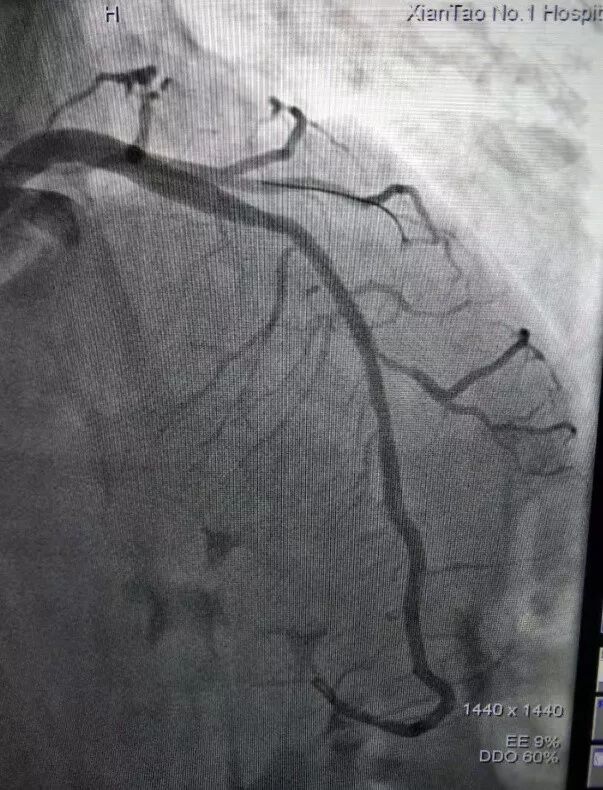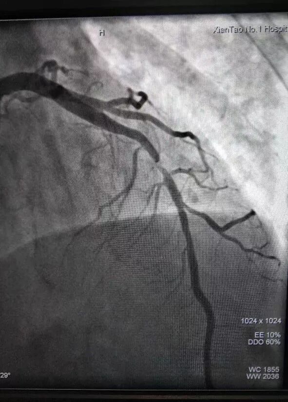 患者达到心血管内科病房,复查心电图后,立即给予抗血小板、调脂、溶栓等治疗缓解症状。随后,进行介入手术。冠脉造影提示前降支中段有血栓,导致血管近乎闭塞,经过40分钟的手术,成功植入支架一枚,复查造影提示支架形态良好,血管畅通,患者转危为安。