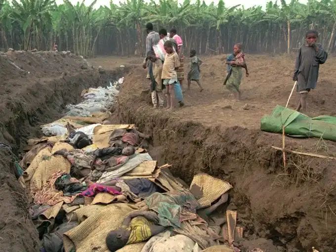 1994年7月25日:在第一个确认的案件发生一周后,官方报告的死亡人数为14,000人,感染90,000人。推土机被用来挖掘岩石以建造乱葬坑。在墓地,等待卸下尸体的卡车上出现了交通堵塞。只能运载40具尸体的卡车每天24小时运转。在营地里,难民们在街上戴着手帕、围巾和外科口罩,试图遮盖腐烂的尸体和刺激性气体的恶臭。难民人数估计为240万。