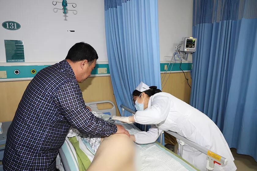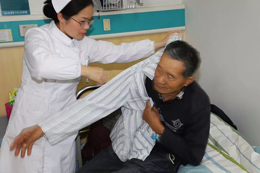 (市一医老年病科护理人员为老人换患服)