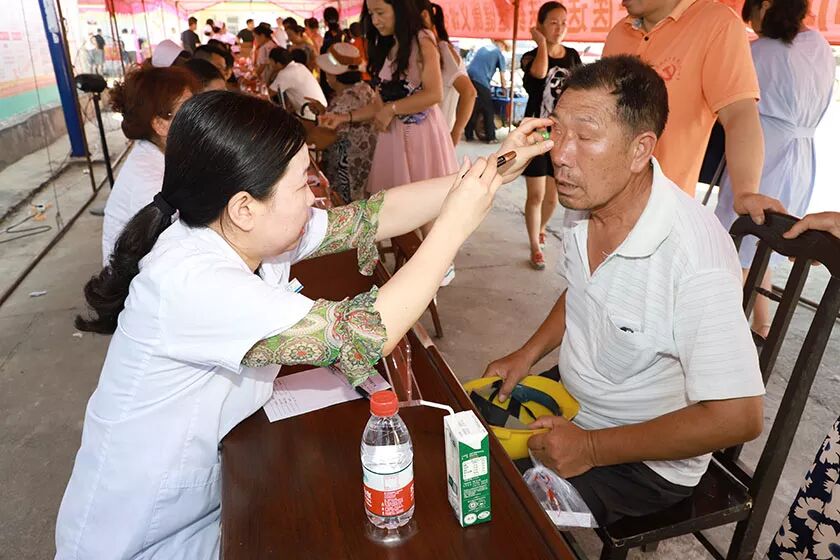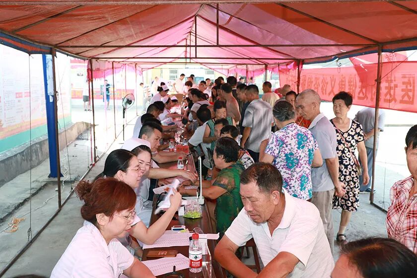 8点,村民们陆陆续续从四面八方聚过来。火辣辣的太阳烘烤着大地,像蒸笼一样闷得让人喘不过起来。前来就诊的村民把专家们团团围住,现场气氛热烈、人头攒动,医护人员忙着量血压、测血糖,忙着查看病情、解答问题,汗水湿透了衣服却全然不知。