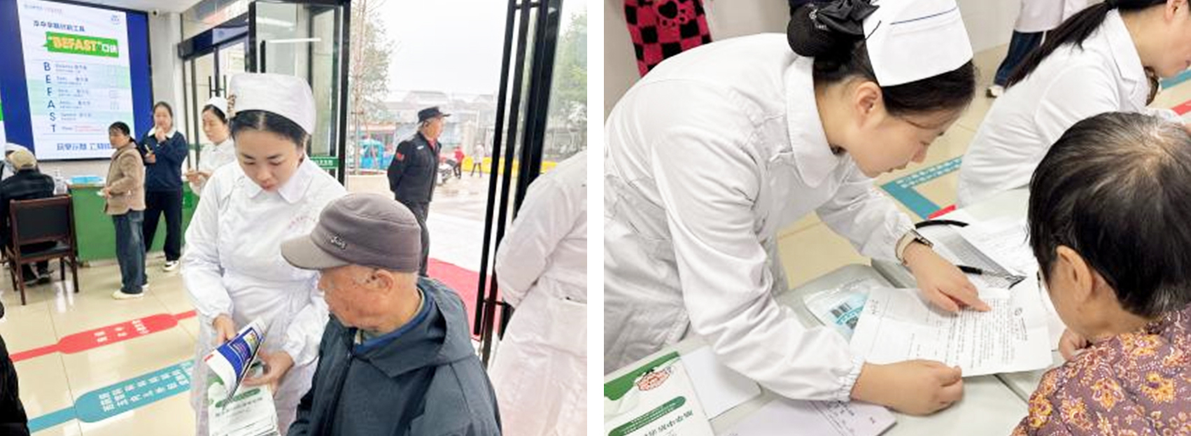 义诊现场,医疗团队为村民提供免费诊疗服务,结合个体情况制定个性化治疗方案,并指导用药。护理团队为村民进行血压、血糖检测,讲解脑卒中危险因素及预防与康复知识,现场演示早期识别“FAST”口诀,介绍急救流程与“120”绿色通道使用方法,并发放卒中防治宣传手册。