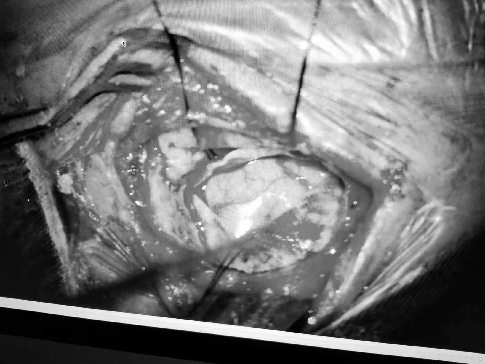 手术当天,在麻醉科团队配合下,神经外科许刚副主任医师在患者左侧眉弓处作3厘米弧形切口,该切口隐藏于眉形内,愈后可不留明显痕迹。手术团队铣开 3×3 厘米骨窗,借助神经内镜的高清视野,精准避开重要血管神经,剪开硬膜、暴露额叶脑组织,释放脑脊液降颅压后分离间隙,顺利找到了约2×4×3cm大小的囊性肿瘤。团队剪破囊壁清除黄褐色囊液后,小心分离与垂体柄粘连的囊壁,后进行脑脊液漏修补与颅骨瓣复位。手术全程历时4小时21分钟,术中出血仅数十毫升。