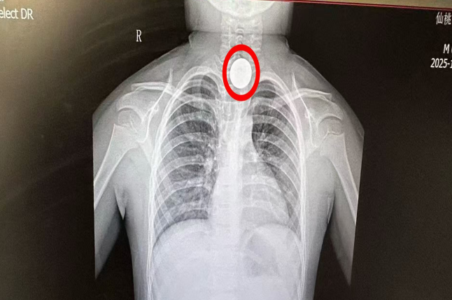 此前,小宇因误吞硬币后出现吞咽困难,被家长紧急送至市一医。胸部DR检查显示,一枚圆形金属异物嵌顿于食道上段,如不及时处理,存在黏膜损伤、食道穿孔甚至引发窒息的风险。接诊的耳鼻咽喉科周宏医师果断决定采用“双腔导尿管食管异物取出法”(Foley管法)进行处理。该方法无需全麻,创伤极小,但对医生操作技巧与患儿配合度要求较高。
