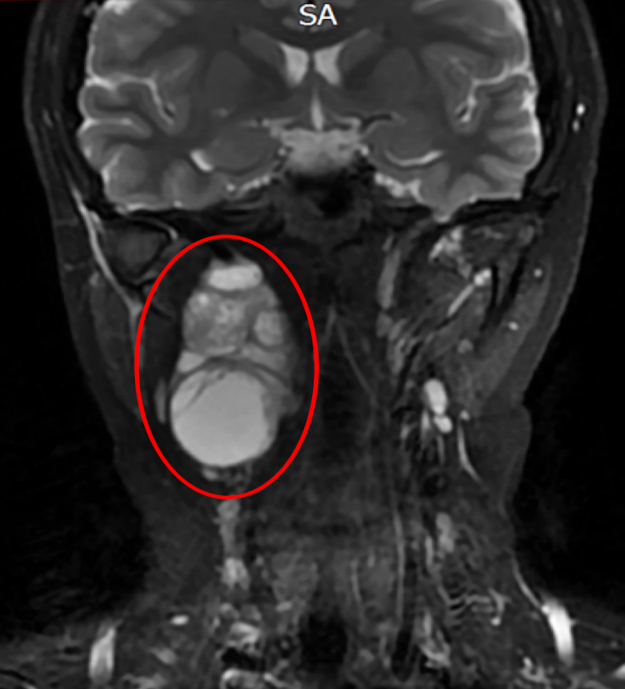 29岁的肖女士(化名)4个月前无意中发现右侧颈部出现一核桃大小包块且持续增大。经超声检查提示右侧颌下囊实性肿块,结合详细体格检查,耳鼻咽喉科团队初步判断肿瘤位于解剖结构极为复杂的咽旁间隙。该区域是颈内动脉、颈内静脉、迷走神经、舌下神经、副神经、舌咽神经等重要结构的密集交汇区。