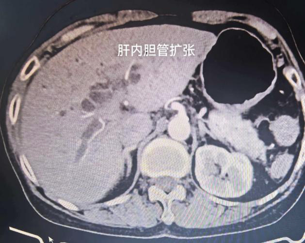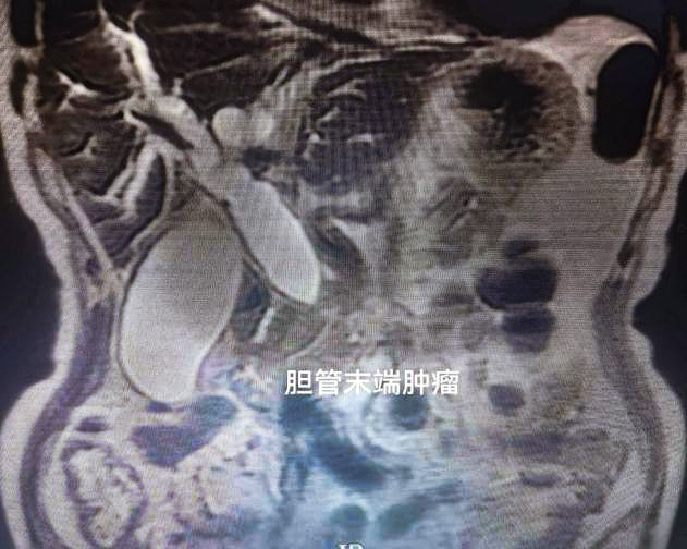 肝胆外科副主任周新红接诊后,敏锐判断病情危重,立即安排上腹部增强CT及磁共振检查。结果显示,患者胆总管下段及胰腺段存在肿瘤性病变,已导致胆道严重梗阻。