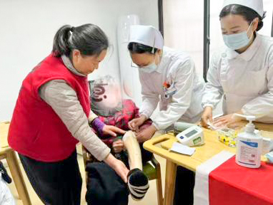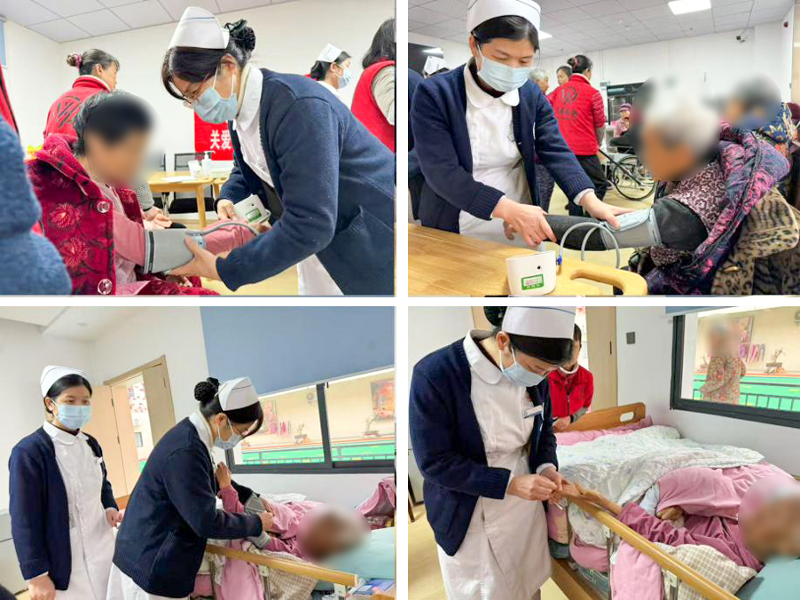 护理团队为老人们测量血压、血糖,对指标异常的老人及时提醒,并用耐心讲解日常监测与控制技巧。