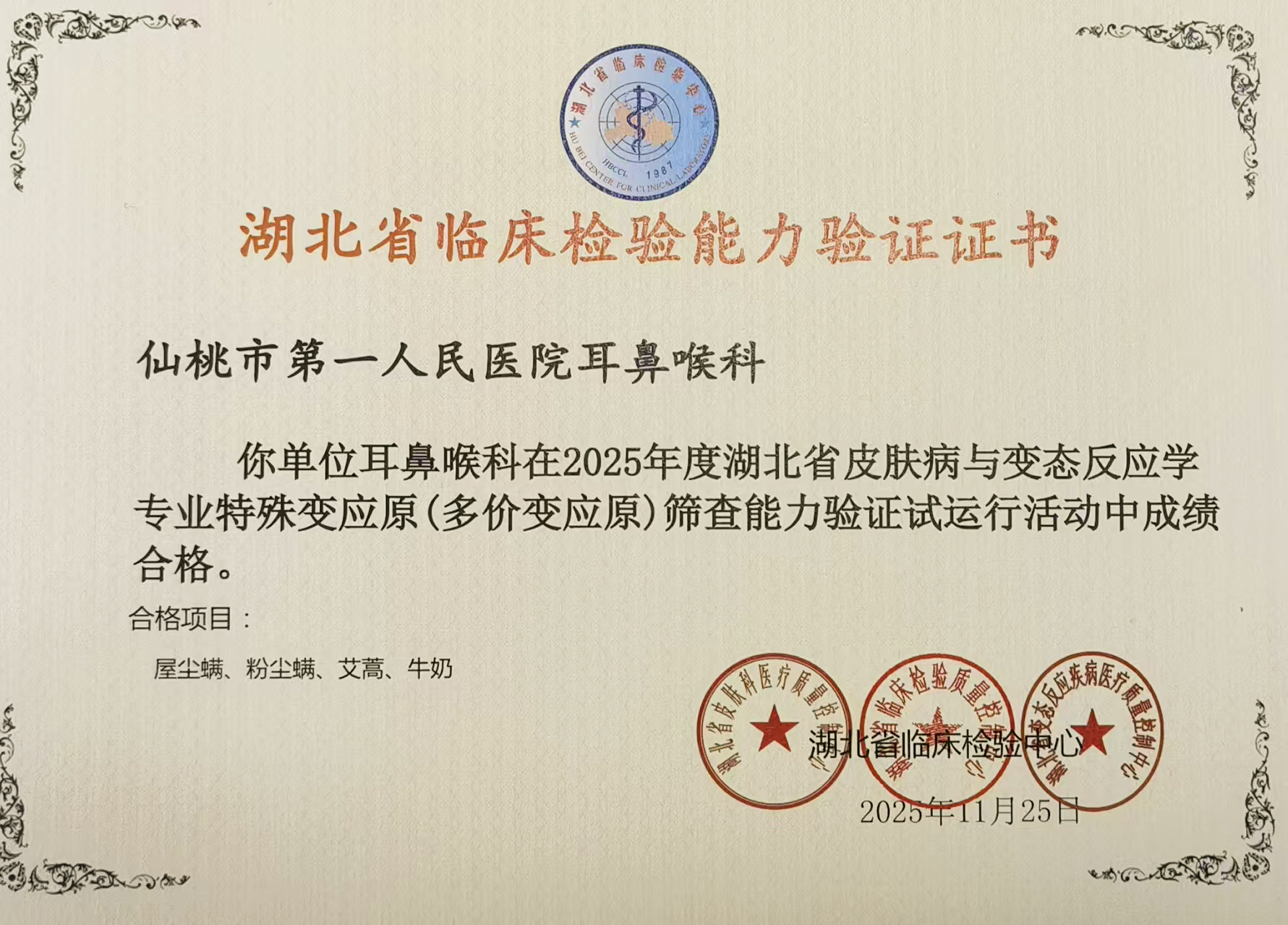 近日,湖北省变态反应疾病医疗质量控制中心召开总结表彰大会。会上,仙桃市第一人民医院耳鼻咽喉科荣获2025年度临床检验室间质评表彰,该荣誉全省仅7家单位获得。