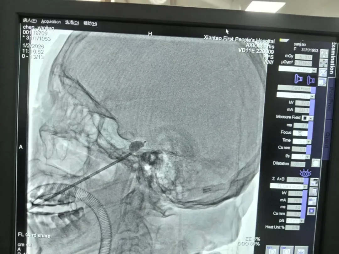 手术当日,曹方军主任带领孙道法副主任医师、王文举主治医师组成手术团队,在全麻下为刘奶奶实施手术。术中精准定位穿刺点,球囊顺利植入,精准压迫3.5分钟后泄压撤出。整台手术仅用时26分钟,患者生命体征平稳,意识清楚。