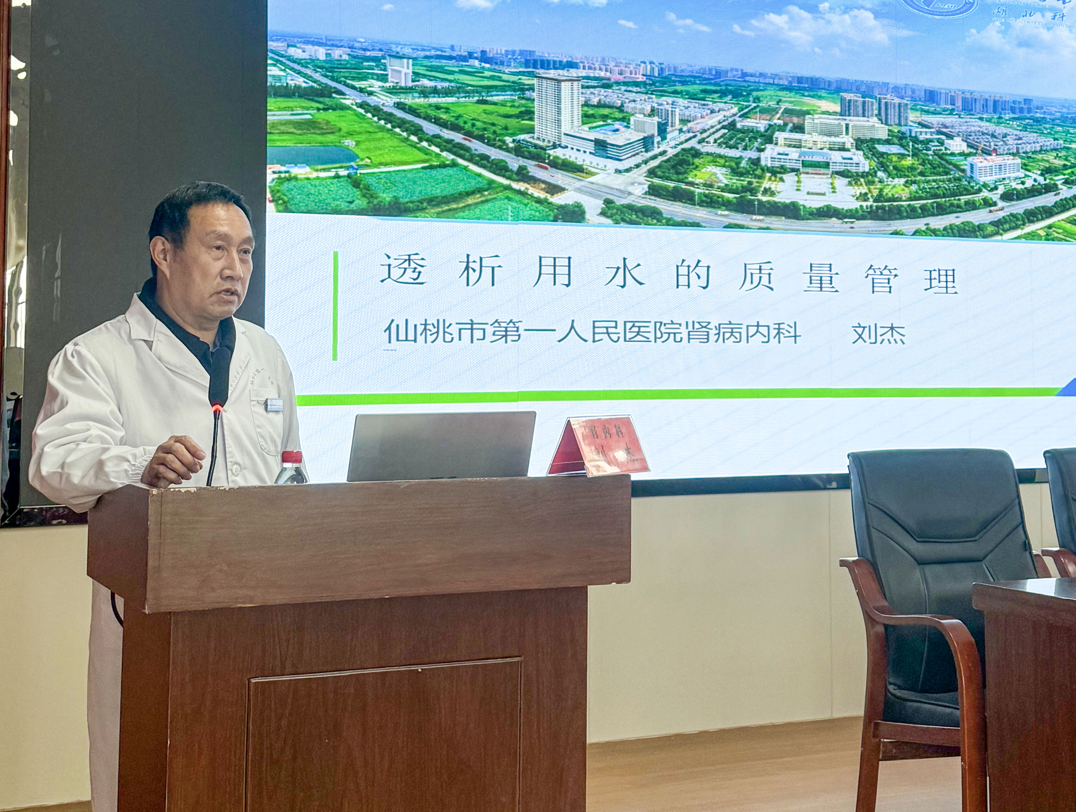 学术讲座环节,市一医肾病内科主任刘杰讲解《透析用水的质量管理》,强调透析液关乎患者远期预后。