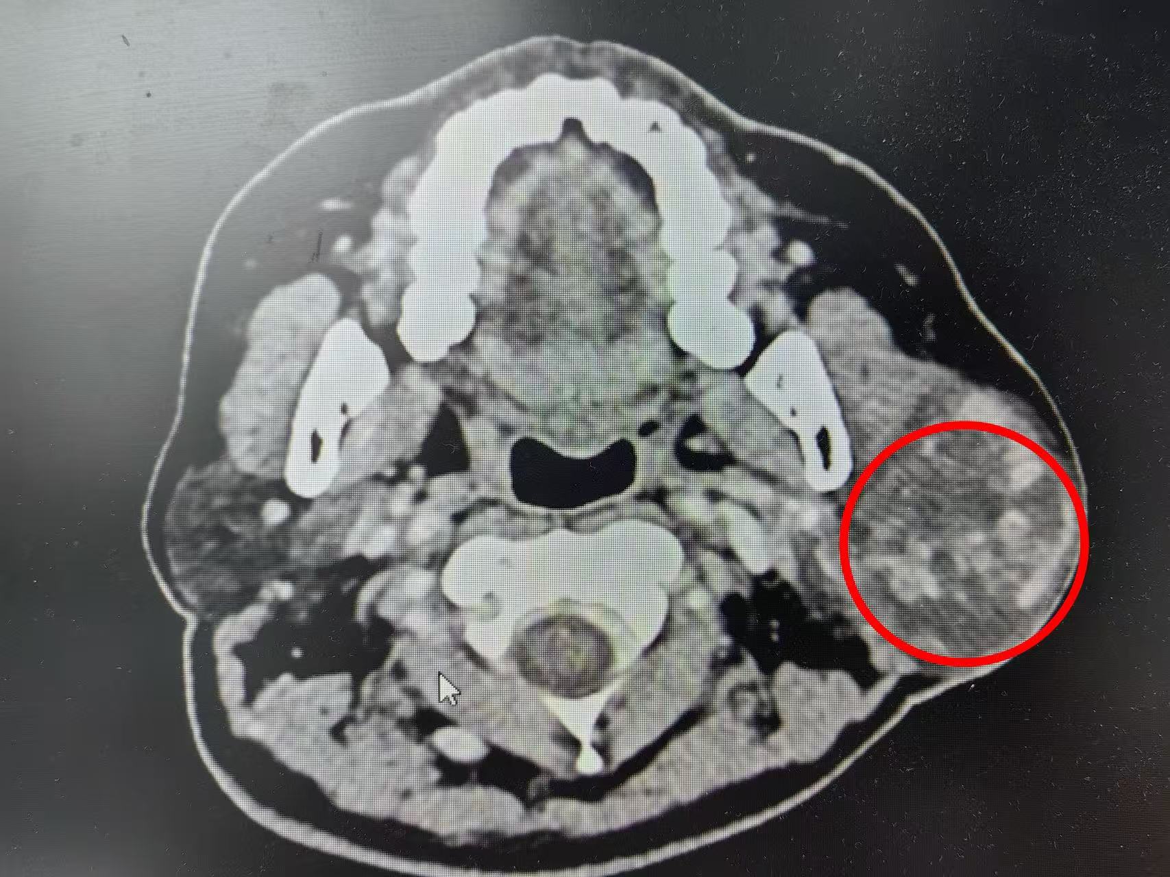 耳鼻咽喉科副主任熊子云接诊后,详细询问病史并仔细查体,为其完善相关针对性检查。腮腺增强CT及超声检查提示,老人腮腺内有一枚约5.3×4.5cm的实性占位,与周边组织粘连较严重,考虑为“腮腺混合瘤”。