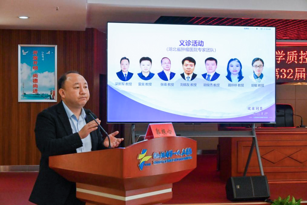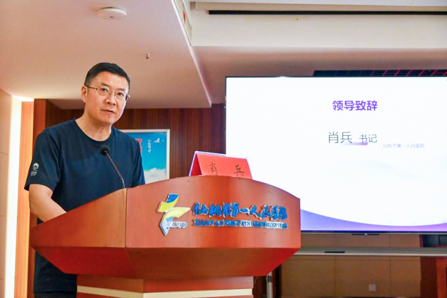 仙桃一医党委书记肖兵致辞,强调肿瘤防治是健康仙桃建设的重要组成部分,呼吁构建“防、筛、诊、治、康”一体化服务体系,携手筑牢防癌抗癌防线。