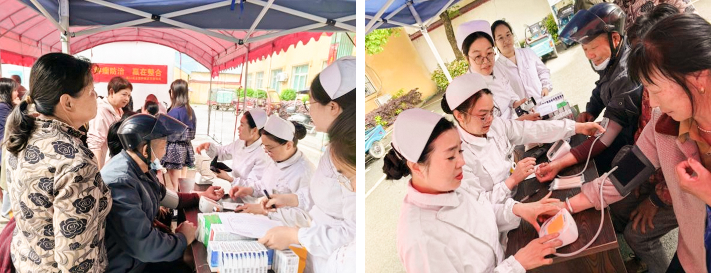 护理团队为村民免费测量血压、血糖,发放肿瘤防治宣传手册,倡导大家树立“早发现、早诊断、早治疗”的科学防癌理念。