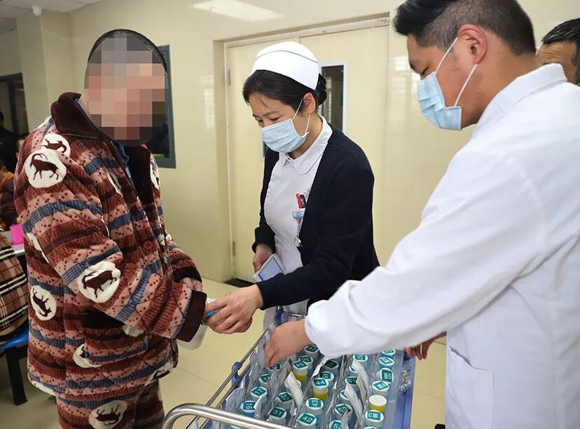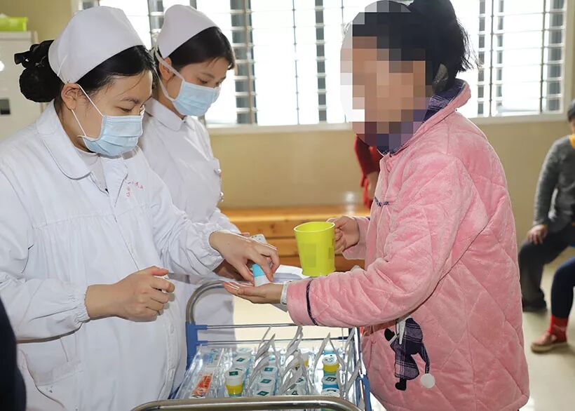 护理人员每天为患者发放口服药,护工检查服药情况,避免有些病人藏药,吐药。