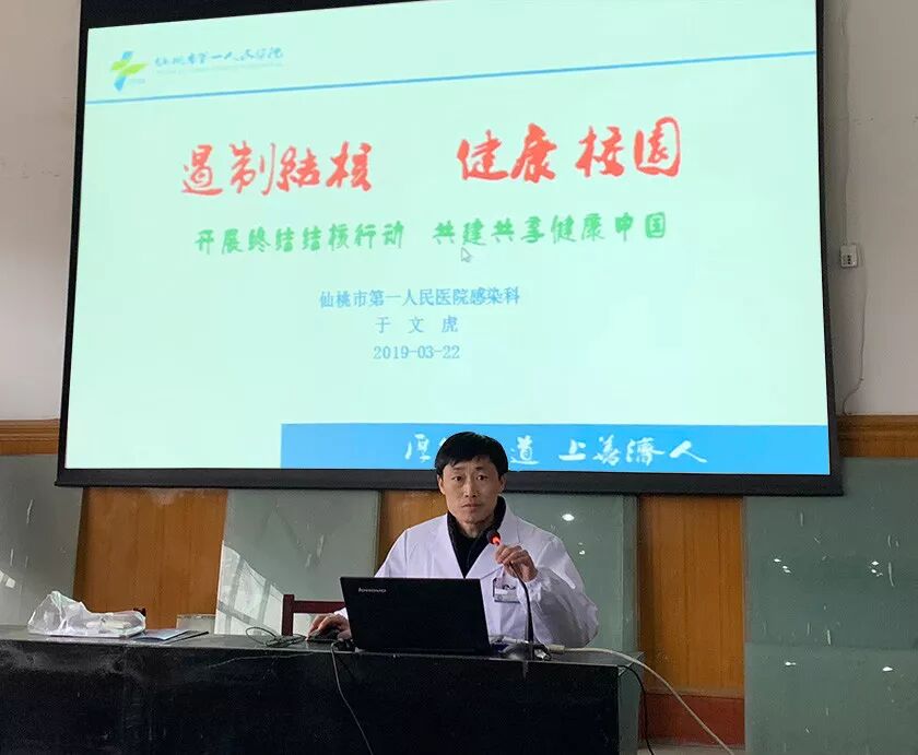 于文虎主任为仙桃中学180余名师生代表进行结核病专题讲座,于主任用贴近校园生活的生动案例,深入浅出地向师生们讲解结核病的起源与危害,感染途径和常见临床症状,学校结核病高发原因及科学防控措施。